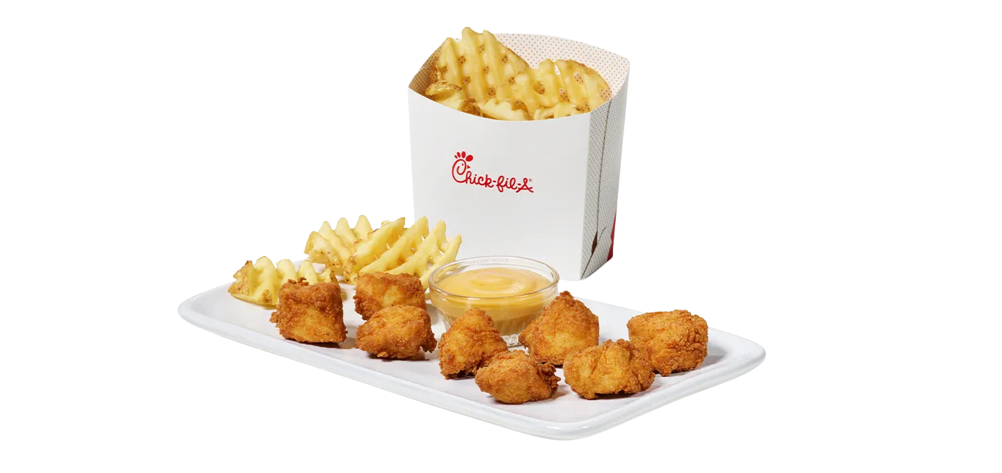 Bite-sized pieces of boneless chicken breast, seasoned to perfection, freshly breaded and pressure cooked in 100% refined peanut oil. Available with choice of dipping sauce.