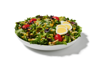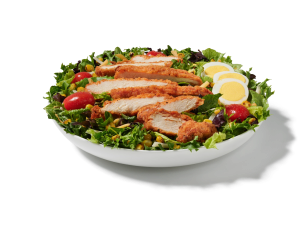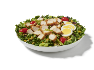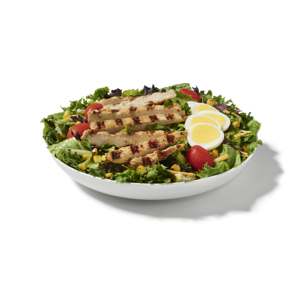 Grilled chicken filet sliced and served on a fresh bed of mixed greens, topped with roasted corn, shredded Colby Jack cheese, sliced hard-boiled egg and grape tomatoes. Prepared fresh daily. Pairs well with Light Italian dressing.