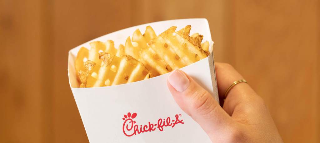Waffle-cut potatoes cooked in canola oil until crispy outside and tender inside.